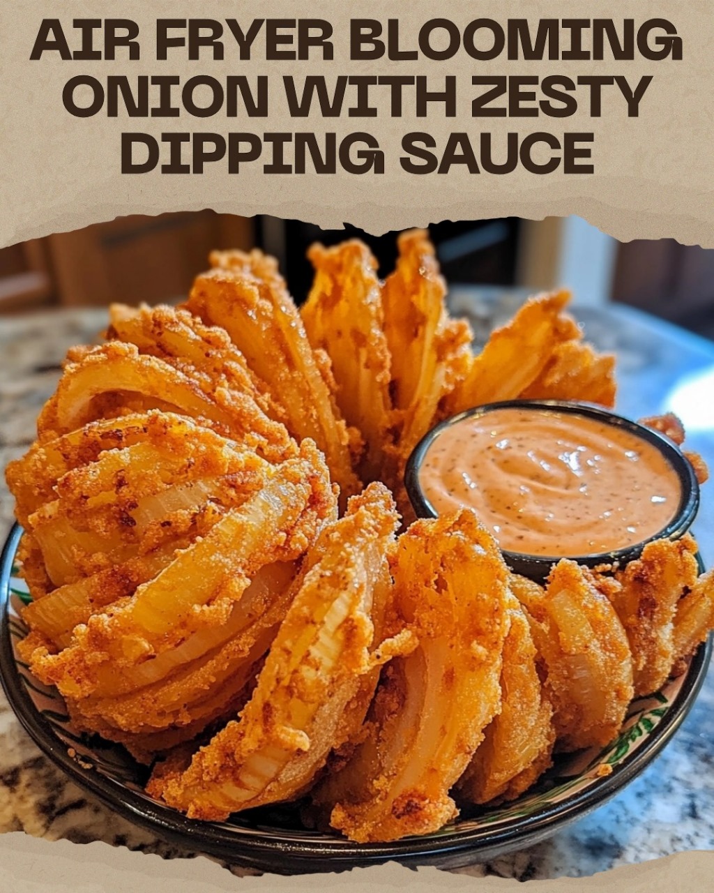 This Air Fryer Blooming Onion is a healthier twist on the classic deep-fried appetizer. Crispy, golden, and perfectly seasoned, it’s served with a tangy Zesty Dipping Sauce that adds a burst of flavor. Using an air fryer cuts down on oil without sacrificing crunch, making it a guilt-free indulgence!