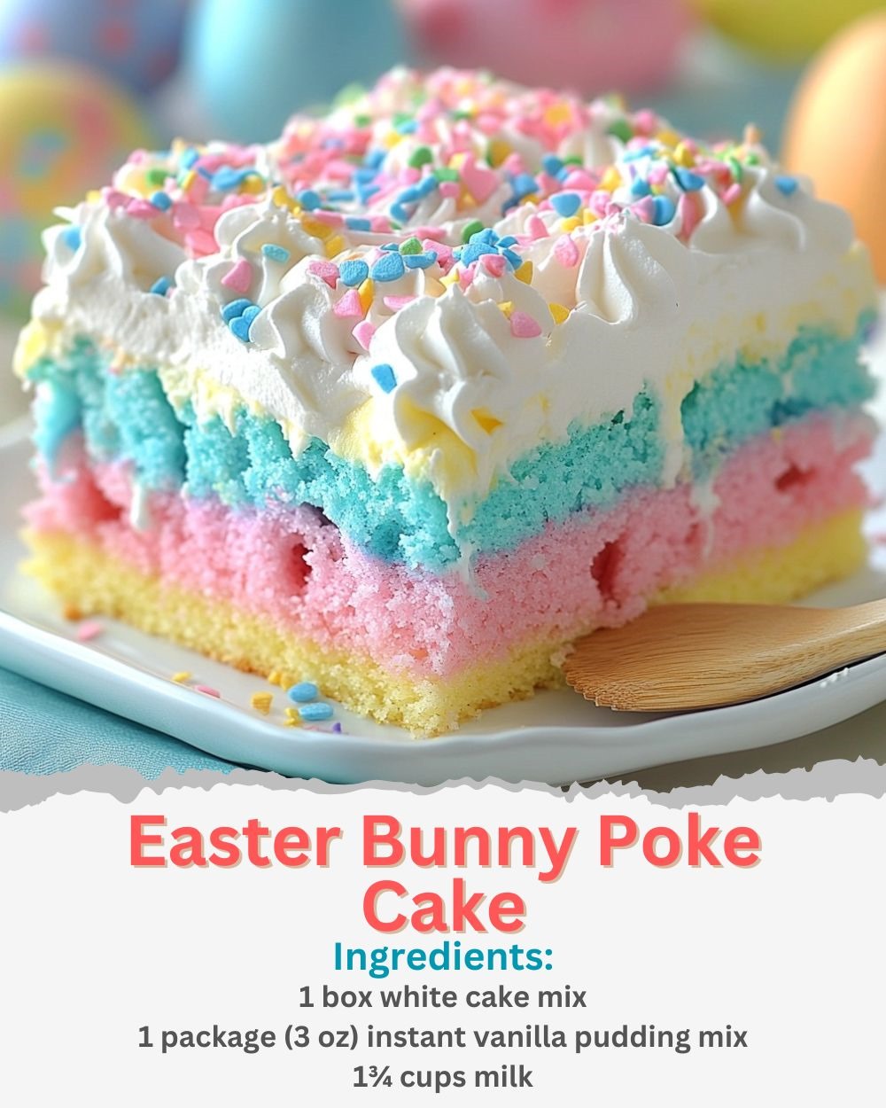 There’s something magical about Easter—the blooming flowers, the vibrant colors, and the joy of gathering with loved ones. One of my fondest memories is baking this Easter Bunny Poke Cake with my grandmother. The colorful layers and delightful flavors made it the star of our family gatherings. Today, I share this cherished recipe with you, hoping it brings as much joy to your celebrations as it has to mine.