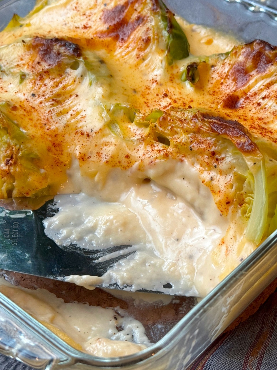 Pour the sauce over the cabbage, sprinkle on paprika, and pop into the oven until it is nice and bubbling hot.