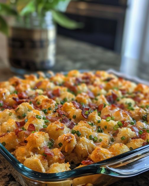 Cracked Out Chicken Tater Tot Casserole is a delicious, comforting dish that’s perfect for family dinners or potlucks with friends. Combining the classic flavors of chicken, bacon, and cheese with the kid-approved crunch of tater tots, this casserole is a big hit in our house. It’s an easy meal to throw together, but it feels special enough for any occasion. Plus, it’s a great way to use up leftover cooked chicken!