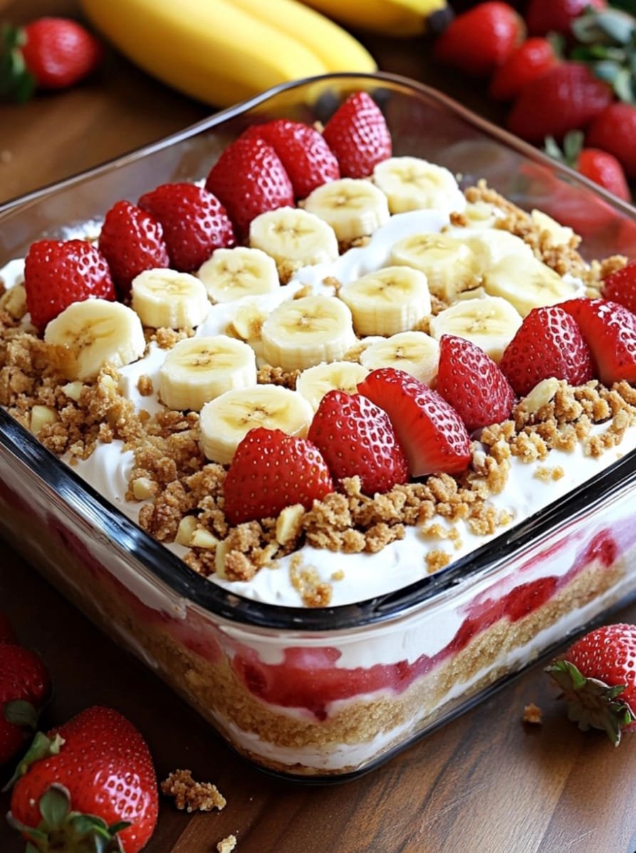 This delightful dessert layers a graham cracker crust, creamy cheesecake filling, fresh bananas, pineapple, and fluffy whipped cream, topped with cherries and chocolate syrup – just like a banana split! It’s incredibly easy and perfect for hot days or when you need a crowd-pleasing treat.