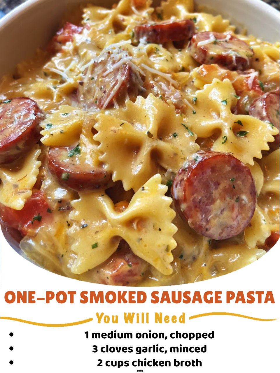 Smoked sausage and pasta simmered in a creamy sauce with cheddar, all cooked in one pot for effortless cleanup.