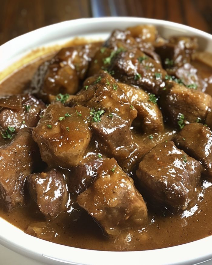 Slow Cooker Beef in Onion Gravy is a hearty, comforting meal that’s perfect for busy days when you want something delicious without spending too much time in the kitchen. The beef becomes incredibly tender as it cooks in a rich, savory gravy made with onion soup mix, cream of mushroom soup, and Worcestershire sauce. Serve this dish over mashed potatoes, rice, or egg noodles for a complete meal.
