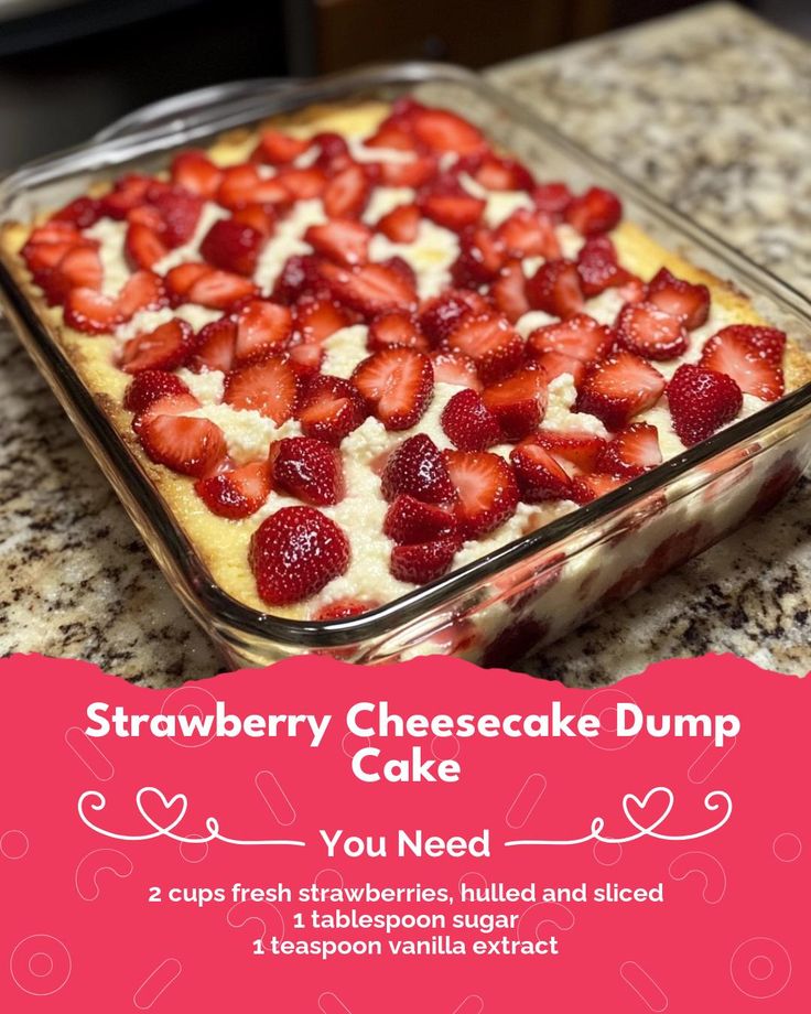 Evelyn – Strawberry Cheesecake Dump Cake Decadent Strawberry Cheesecake Dump Cake with Creamy Layers Ingredients: 1 box vanilla cake mix 1 (8 oz) package cream cheese, softened 1 cup powdered sugar 1 cup strawberries, sliced 1/2 cup unsalted butter, melted 1 cup milk 1 teaspoon vanilla extract 1/4 cup granulated sugar 1/2 teaspoon ground cinnamon 1/4 cup fresh strawberries for garnish Directions: Preheat your oven to 350°F (175°C). Grease a 9×13-inch baking dish. In a medium bowl, beat the softened cream cheese and powdered sugar until smooth and creamy.