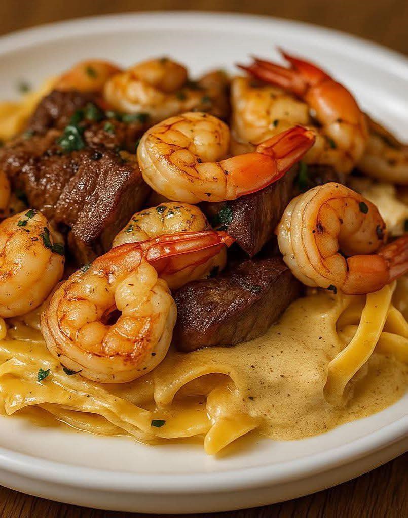 Tender steak bites and succulent shrimp, served over creamy Alfredo-coated fettuccine – the perfect luxury pasta dish!